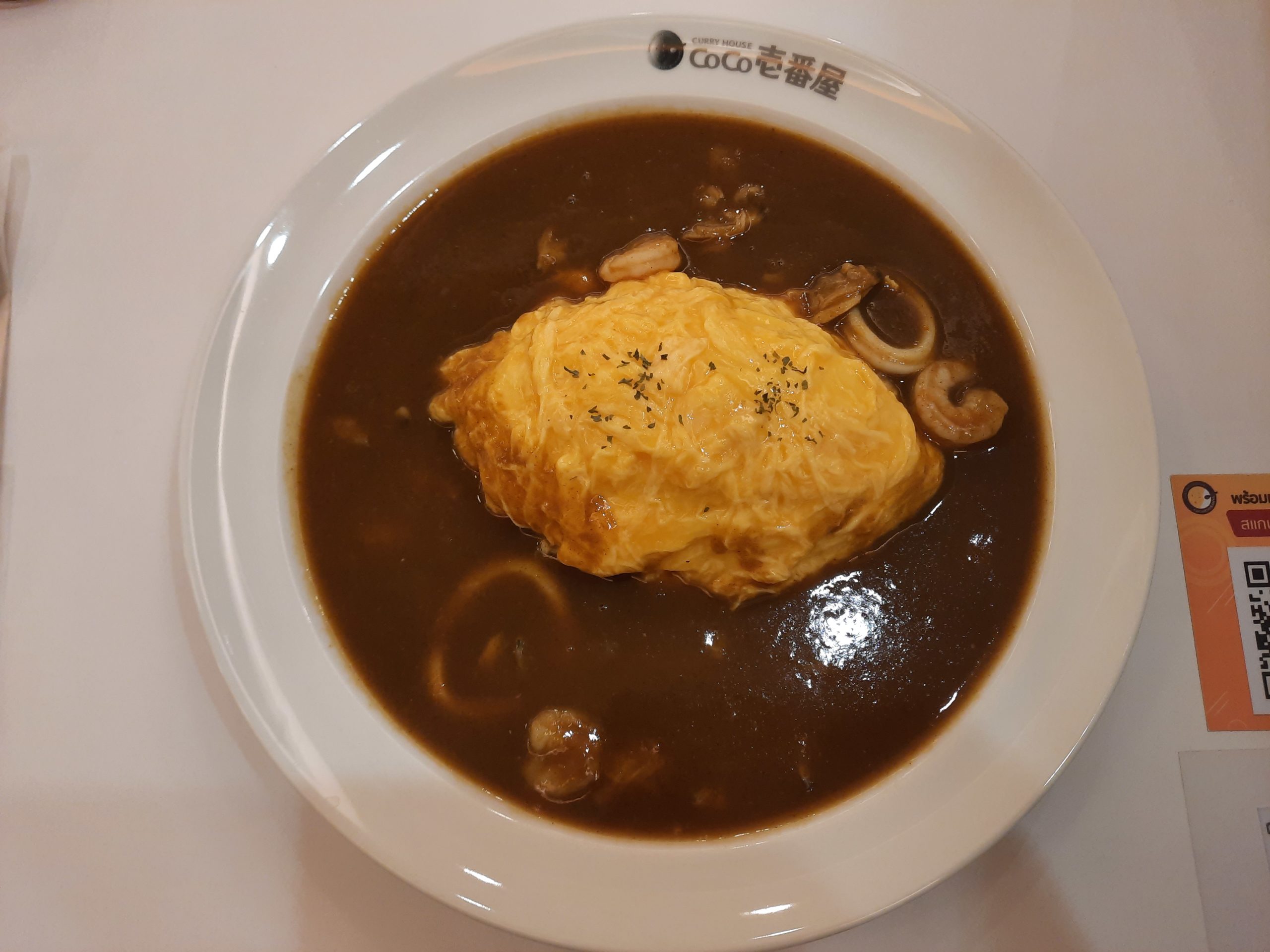 今回注文したのは、シーフードオムカレー(205バーツ)です。写真と比べるとシーフードが少なく見えたのが少しだけ残念です。