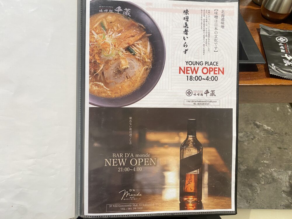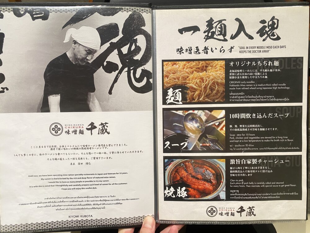 というのも、店主がもともと千葉県で20年以上(一説には30年以上)ラーメン店を経営されていたベテランだったそうですが、日本での長いキャリアを終え、一度は引退も考えてお店を閉められたそうです。しかし、ご縁があってベトナムへ渡り、2019年にホーチミンで「味噌麺 千蔵」をオープンさせ、その後こちらのバンコク店をオープンしたそうです。