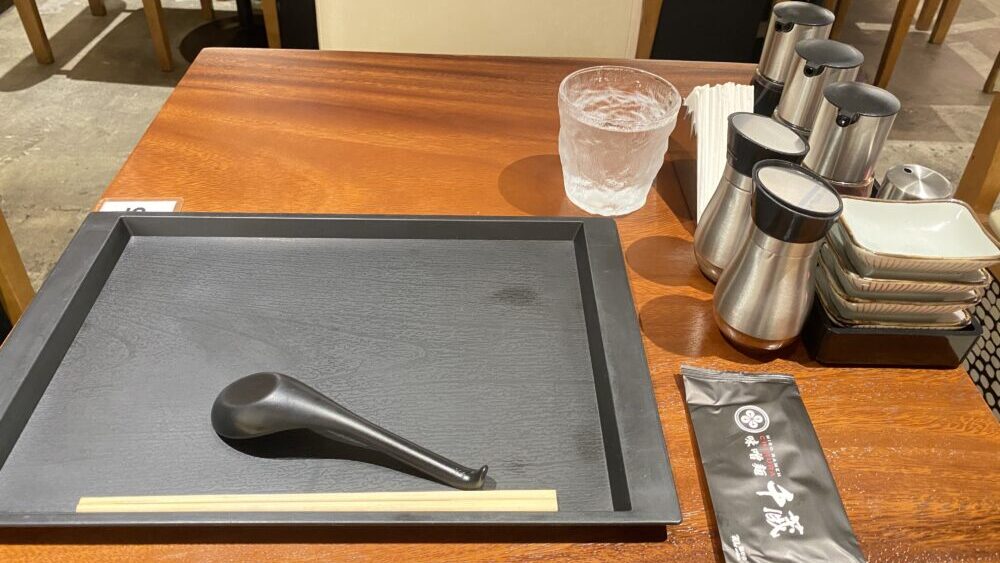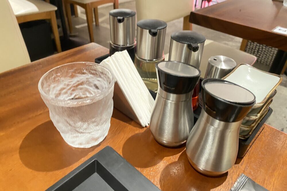 テーブルセットは一般的な醤油、お酢、ラー油、七味、胡椒など。