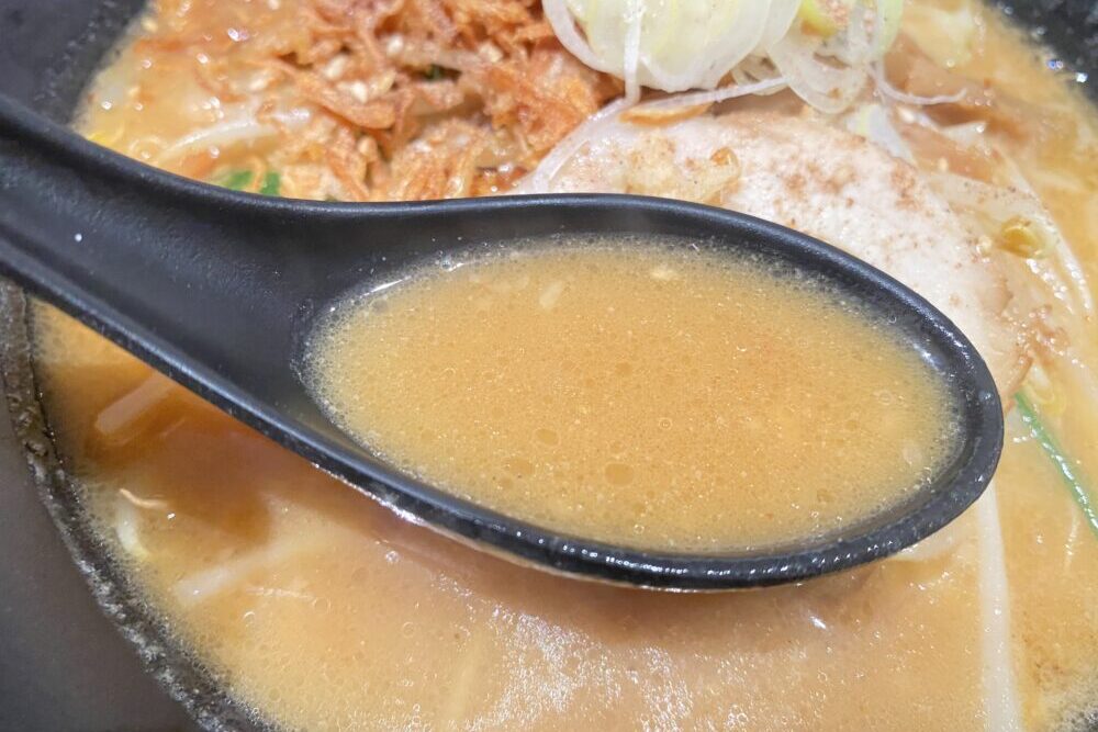 まずは、味噌ラーメンの命ともいえるスープをチェック。