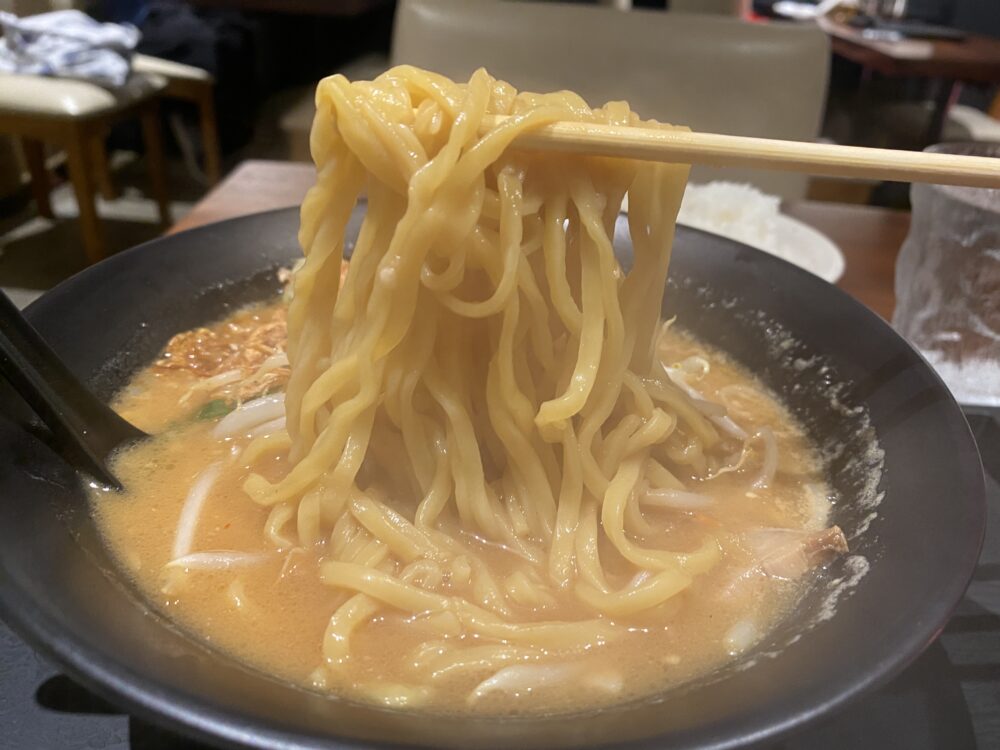 麺は味噌スープにしっかりと絡む中太ちぢれ麺で、濃厚味噌の味がしっかり付いてきます。