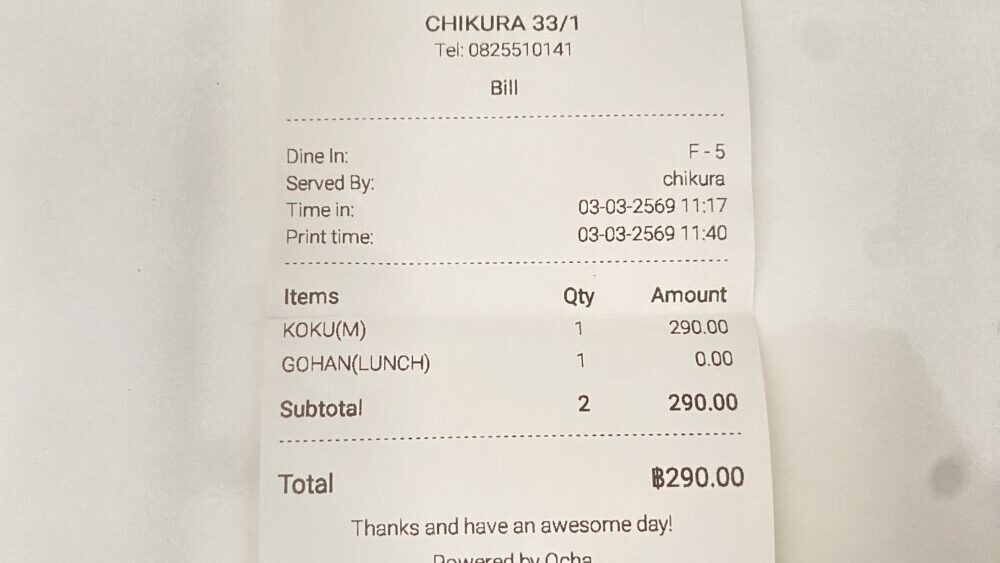 この日のお会計はこく旨味噌らーめんを一杯注文して合計 290THBでした。